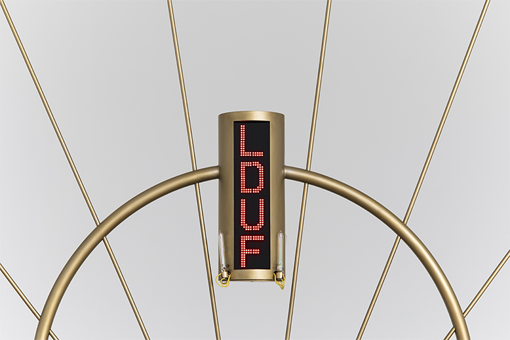 郭城的装置作品 “抽象神谕生成器” 悬挂在魔金石空间的展厅中央,中心一只铜磬向外发射出八道金色的光芒,正上方是一个符咒模样的屏幕。它如同一位技术先知,观众拿起磬锤敲击铜磬将之唤醒,余音袅袅中,屏幕上逐一显示出四个大写英文字母,像是一句网络暗语。你调动自己的语言本能和网感,尝试破译这条随机生成的谜题。这个情景很像 2020 年人们大部分时间的状态,在神、技术、随机事件和更加扑朔迷离的网络信息中寻找答案。