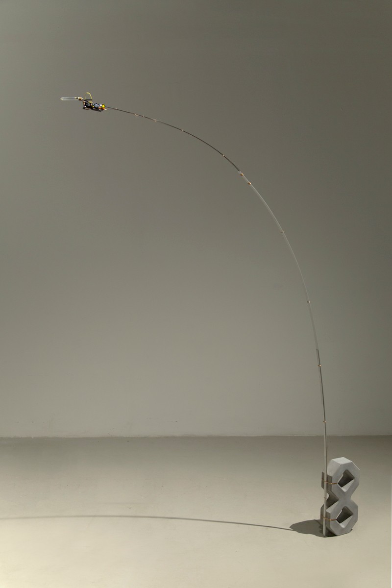 (临时的)小器具,2018,郭城。在这件作品中,长杆末端的盖革米勒管(Geiger Muller tube)探测着环境中的辐射值,并随着接收到的辐射离子不断晃动,直至环境中的本底辐射强度衰减至人类纪开始之前的水平时才会停止。如果这可能发生的话。