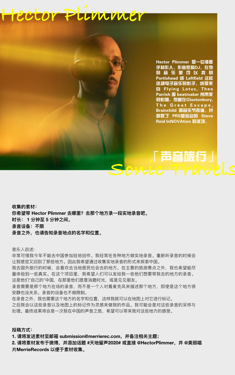 · 或将素材发布于微博,添加话题#天地留声2020#或直接at三位音乐人的微博,以及@美丽唱片MerrieRecords 以便于素材收集。