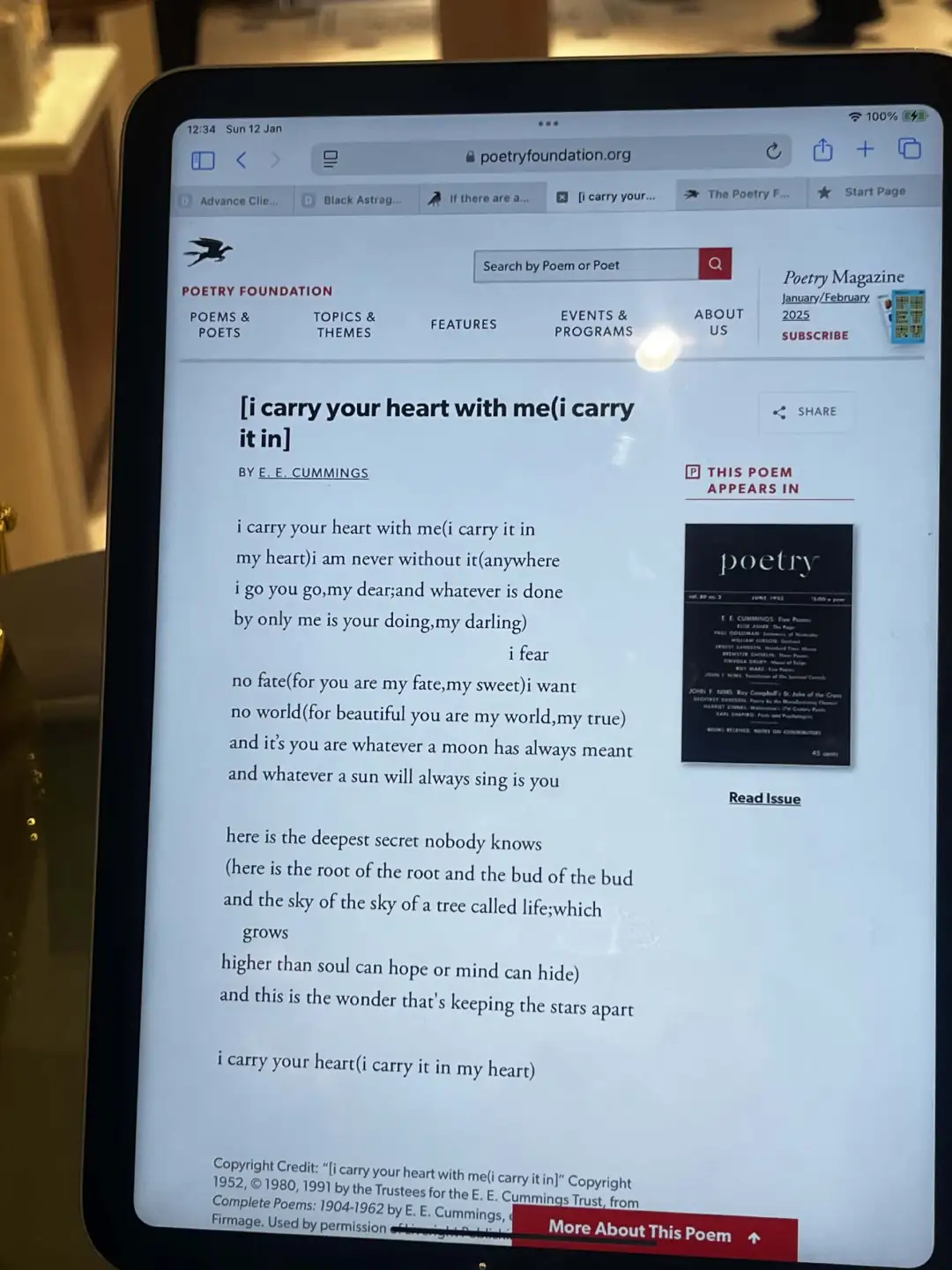 i carry your heart with me(i carry it in my heart) i am never without it(anywhere i go you go, my dear; and whatever is done by only me is your doing, my darling)