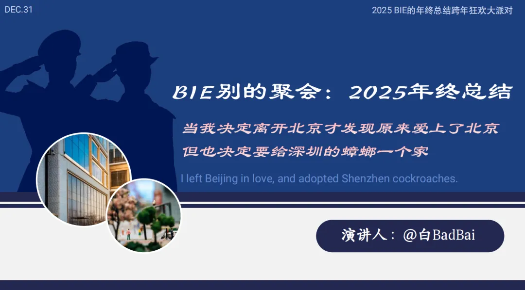 比如,离开北京才发现原来爱上了北京但也决定要给深圳的蟑螂一个家的白BadBai,在跨年夜给我们整了一出大厂 PPT 展示会: