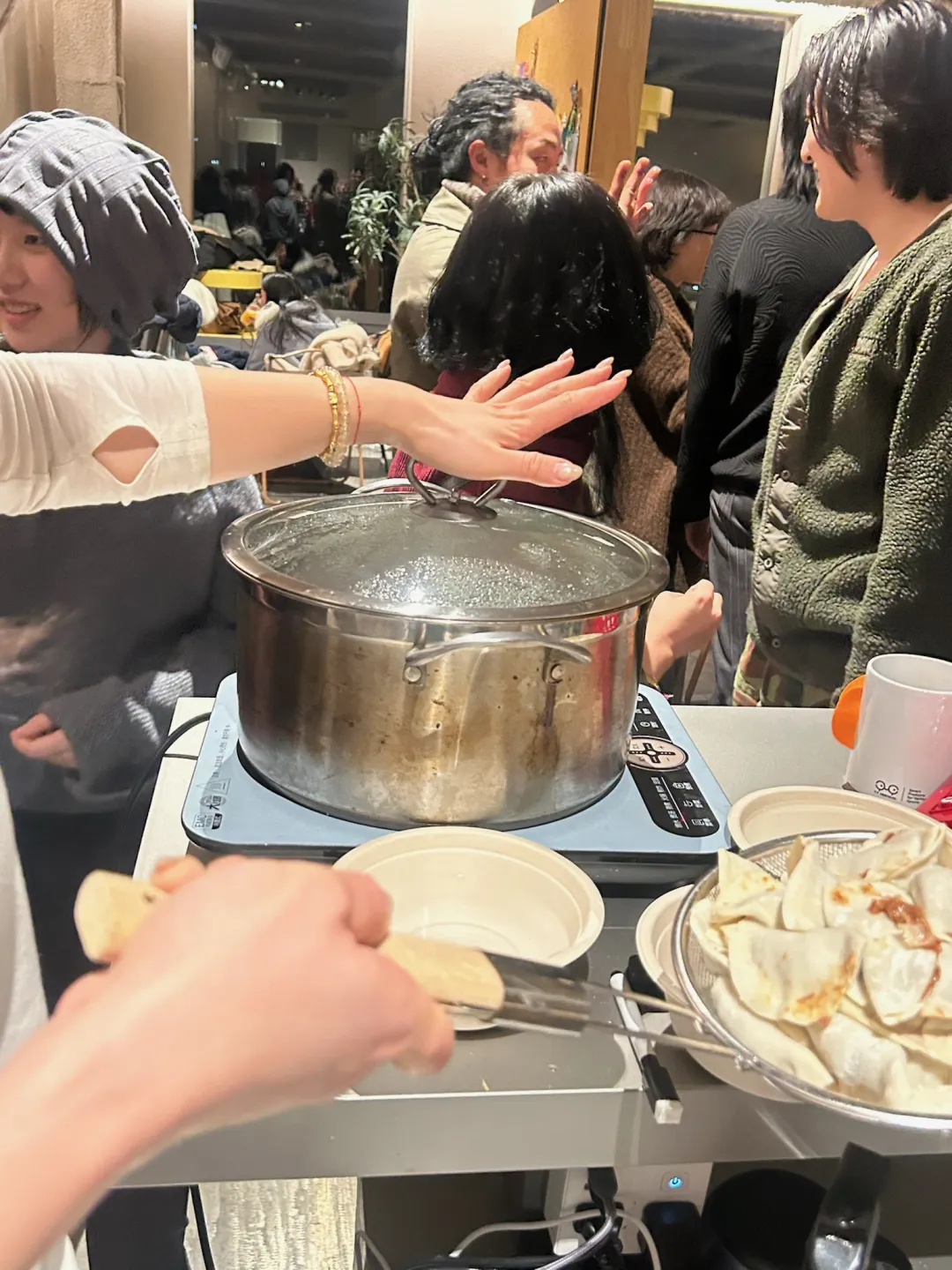 所以,我们在派对上做了一件没那么派对的事——在跨年后,大家一起上楼去别的盒子包饺子。