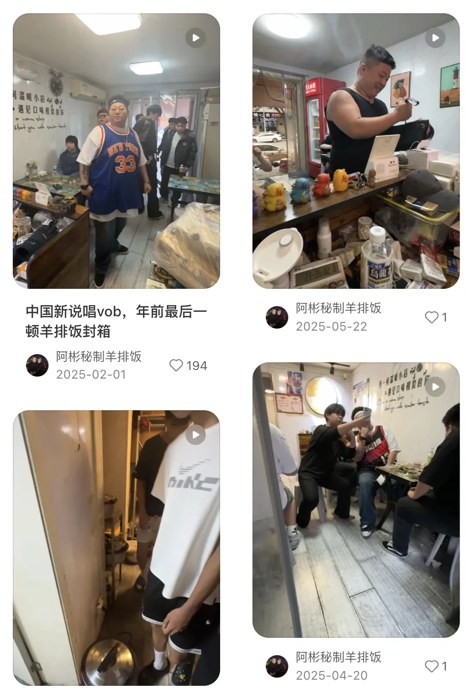 通过社交网络,这种“我玩我的”精神延伸到了线上。社区老炮与青年文化的对冲,终于引起了大家的关注。如同虹吸效应般,不同年龄层的人都在阿彬羊肉馆找到了自己的精神归属。嘻哈人、地雷系、Y2K 等小众群体会过来参与这场从线上走到线下再到线上的“亚文化自循环奇观”,但里头同样也还有正常的食客。见过“市面”的天津本地人并不会对此有多大惊小怪,所以才形成了这种看似奇异实则合理的效果。
