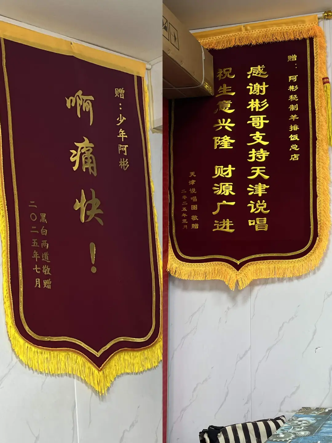阿彬羊排饭的店里挂着两幅锦旗,一个是天津说唱圈敬赠,另一个是黑白两道敬赠,非常 ganster,也非常让人疑惑。毕竟羊排饭店看起来和说唱圈应当毫不相干。