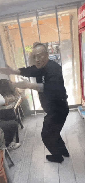 之前看阿彬的视频,他经常突然在店里跳舞表演行为艺术,略带点后现代主义色。例如阿彬自创的 “手刀舞” 令人印象极深,如同输入了错误指令的 AI 仿生人,略显笨拙地重复着一个动作,乱入在店里排队吃饭的人群。大家围观、好奇、议论的荒诞画面,让我觉得真人终于战胜了 AI。面对阿彬的迷惑行为,店里的人有时被吓一跳,更多时候只是抬起头来会心一笑,然后继续埋头干饭。