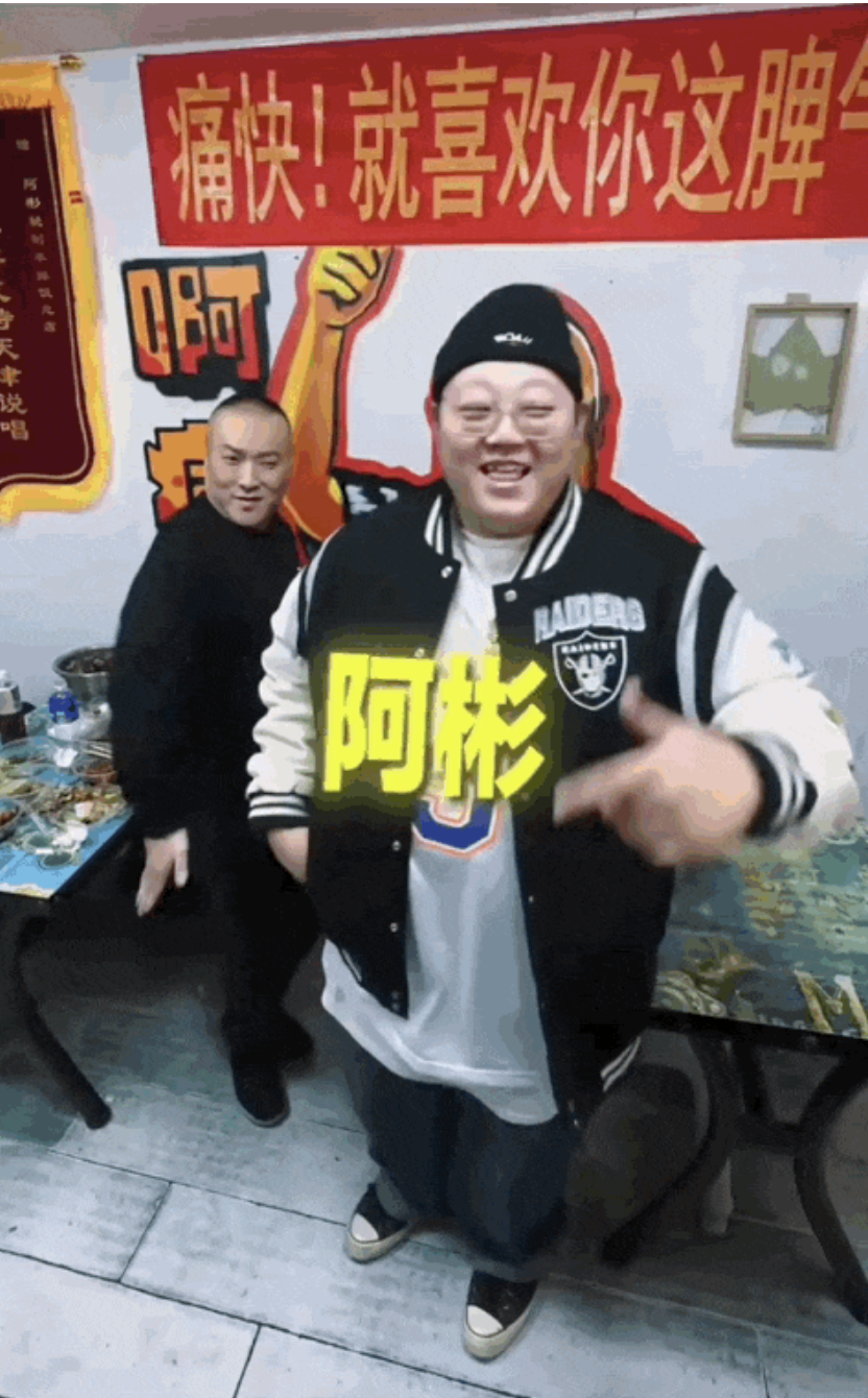 但如果你经常刷抖音的话就很快能理解这事。最近我和朋友经常刷到一个短视频,潜伏在排队人群中的光头大哥,在一个苍蝇馆子里面突然尬舞,说着自创的语言,BGM 总是搭配着相同的 rap。其中“阿彬!阿彬!阿彬羊排饭!”这句天津风味的歌词配合着 808 鼓点的强烈共振,从视频号的众多短视频里面脱颖而出,一条接着一条不断给我推送,令人上头,不断循环。