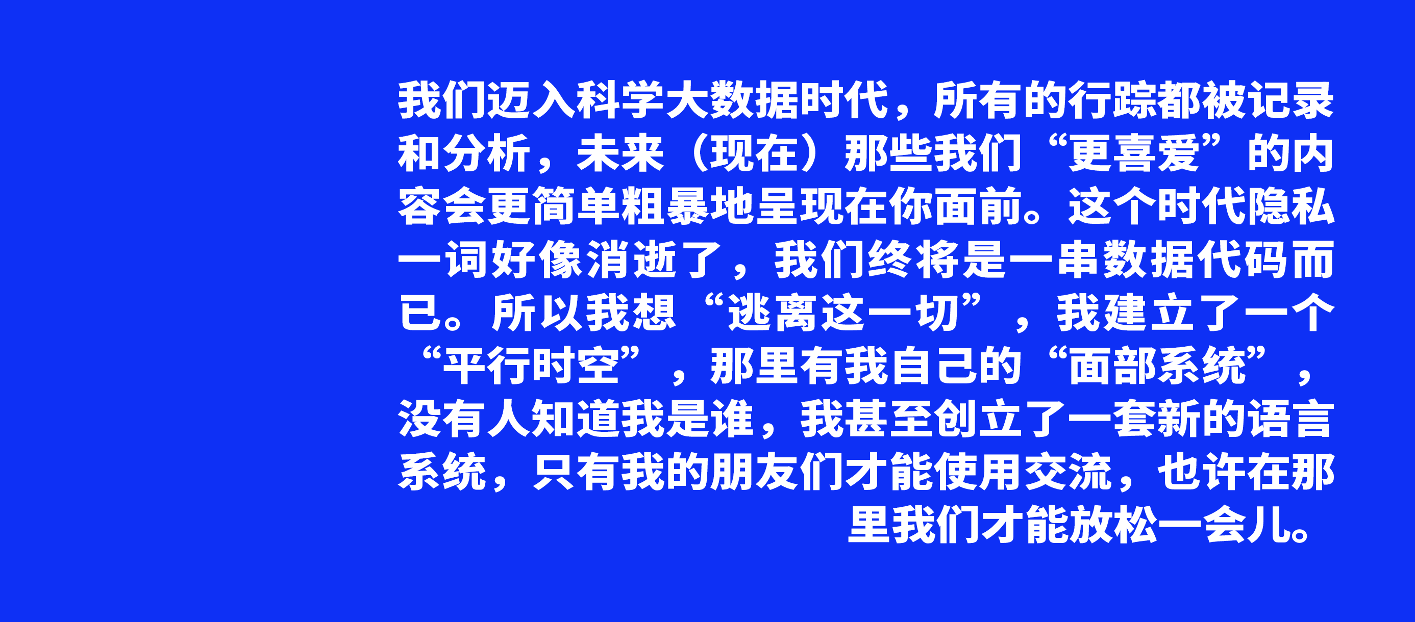 在这次我与意大利设计师合作的项目中,他帮助我在项目里构建更生动的世界,更加吸引观众眼球。但是我知道在作品吸引目光的同时,背后需要有更深刻的哲学与文学思考。为了研究这次主题,我阅读了像《科学怪人》、《索拉里斯星》这些作品,都给了我很大的启发。这也不仅仅帮我创作作品,也让我在现实生活中对于科技的发展有了更多维的思考。)