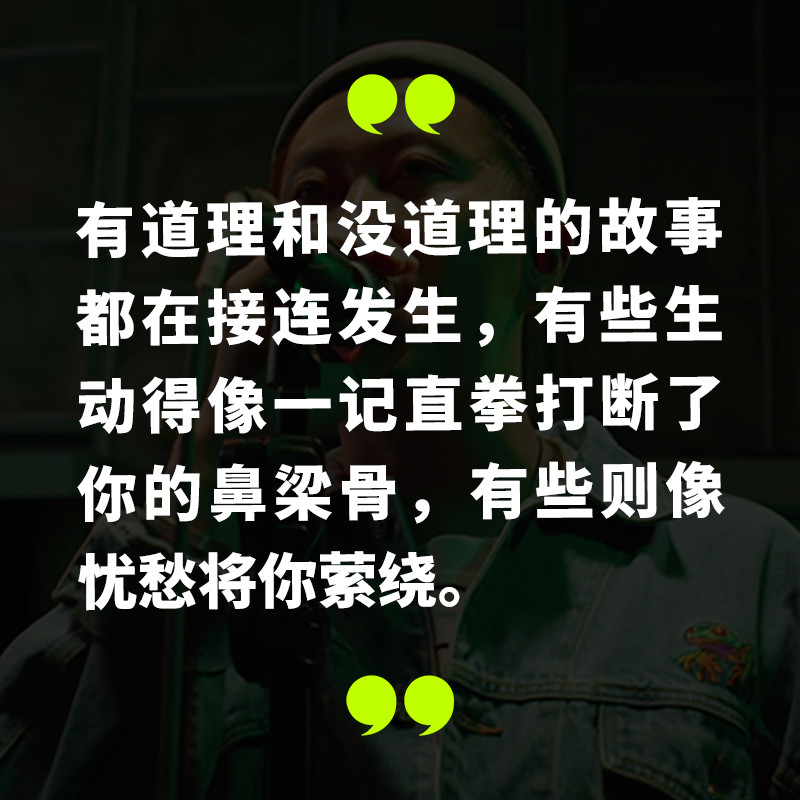 小老虎理解的说唱是 “一张嘴,一个脑子,你此时此地感受到的温度、情绪,和你想表达的问题”。他的舞台只有一支麦克风,在固定的节奏里,他让自己的想象力跟着歌词天马行空,有道理和没道理的故事都在接连发生,有些生动的像一记直拳打断了你的鼻梁骨,也有抽象的,则 “像忧愁一直将你萦绕”。他将四首歌串成一个怪奇的故事,一切从一双没有主人的眼睛开始。“你知道吗,我最近总看到一双眼睛在盯着我。那双眼睛的主人是谁,我不知道,但我从各个地方看到它:有时候从你戴的眼镜镜片的反光里,有时候从我路过的积水里;有时候阳光透过树叶,耀眼的光芒里——我看到那双眼睛在直勾勾地瞪着我。” “直到有一天晚上,我躺在床上,闭上眼睛,有一股热气喷到我的脖颈。我睁开,终于发现了这双眼睛的主人,原来它是一只老虎。”