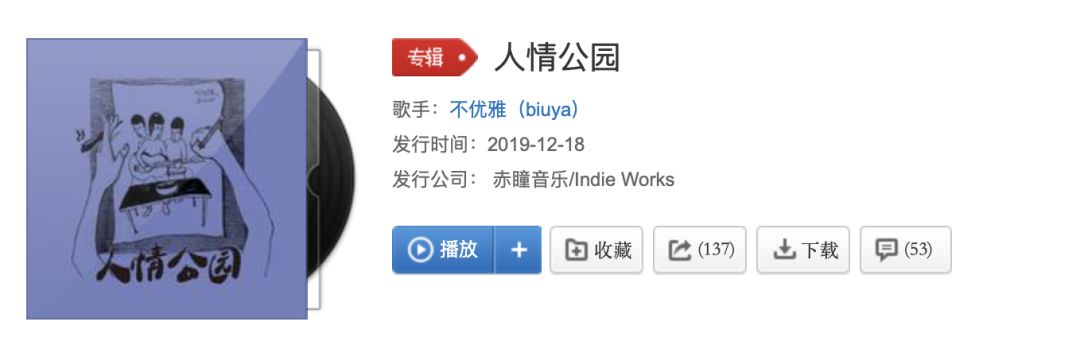 元帅上大学的时候写过一首歌叫做《人情公园》,但没写完。“其实以前写这首歌的时候,想法跟字面含义不一样,没有特别对人和人之间的关系有所指”,它的出处是一个掌机游戏,有个黑道人物为了感谢别人的帮助,建了一座 “人情公园”。秋爽倒是觉得这个名字跟大家的现状挺搭的,“掉入了各种人情世故当中,工作、婚姻、家庭”,就拿来做了 EP 名字。“这首歌可能还需要好几年才能写完,也可能永远都写不完,不如现在拿出来用,先把名字抢注了”,秋爽说。这三首歌出来得非常轻松,“没有太多的整体规划,也不是很完整的概念,只是想出几首歌,挑了些能做出来的。我们有很多未完成的动机。” 2017 年那张《阴天王国》,其实 2015 年就录了。这几年迟迟没有发新作品,元帅说必须得逼逼自己,“必须出几首歌,保持状态,不然就会拖很长时间。”《人情公园》是不优雅第一次跟制作人陆希文合作,跟之前的作品相比,变化挺大的。“这次没有受限于 ‘乐队’ 的形式,像《停在空中》这首,就是我先做出来的demo”,元帅说,这是今年的新尝试,也跟他最近听 Hip-hop 和 Urban 有比较多关系。《停在空中》跟不优雅之前的作品太不一样,元帅先有了编曲思路,之后才加入乐队形式编排,不是典型的乐队作品,灵魂不在三大件上;他采样了吹奏和 B-box,元素很多,“中间用的鼓机还有点 R&B”。就是排这首歌比较头疼,因为脑袋里已经有了一个挥之不去的印象,鼓手九龙不知道敲什么好。“后来制作人给了意见,录了一部分鼓 —— 不像之前一轨录完,先录一部分素材,再拼起来”,这样完成了这首歌的录制。秋爽说,换在十年五年前,自己可能没法接受这种,“比如制作人会在母带里加的一些桥段,但现在觉得挺有当下的时代感。”