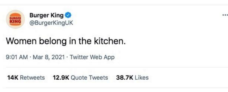 快餐连锁品牌汉堡王在庆祝国际妇女节当天在推特上发布了这条消息:“女人应该待在厨房。”他们随后补充道:“当然,前提是她们愿意的话。只有20%的主厨是女性。我们的使命是通过给更多女性员工从事烹饪工作的机会,来改变餐饮业的性别比例。”这两条消息在网络上疯传,引起了轩然大波。