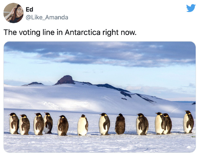 这张图不仅暗示全球都参与了总统大选,而且仅有印度、利比里亚、墨西哥等国投给了拜登(蓝色部分)!甚至南极洲都一心向川,变成了鲜艳的红色。