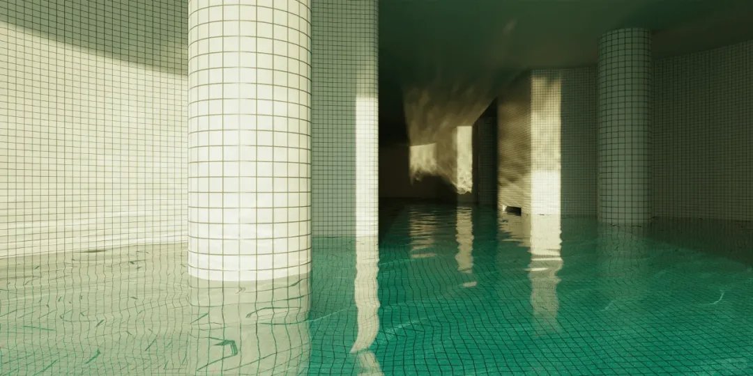 瓷砖的冰冷质感、怀旧的配色、熟悉却空无一人的建筑语境,与水这一媒介产生了一种化学反应;