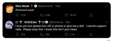 近日,Elon Musk 在推特上发布了 “性别代称是垃圾” 的言论之后遭到了广大网友批评,其中一条就来自 Grimes。她回应道:”我爱你,但你赶紧把手机关了吧,或者给我打个电话,受不了你在这边拉仇恨了,我知道你本意不是这样的。” (这条推特已经被删除)。