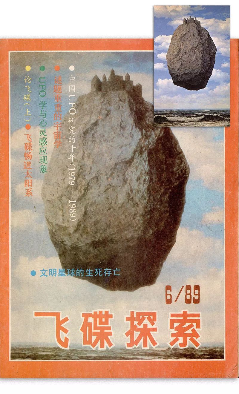 阳春白雪的《飞碟探索》,还曾点评过当代艺术。1989年,我在它的封面上,认识了20世纪中期最富盛名的超现实主义画家雷内·马格利特(Rene Magritte)。马格利特一生都痴迷于描绘悬置与漂浮的物件,1959年的油画 《比利牛斯山的城堡》,是其“漂浮”主题中的代表作。这张封面在我幼小的心灵中,留下不可磨灭的印象 —— 之后的很多年里,我心目中的马格利特,就是个画飞碟的。