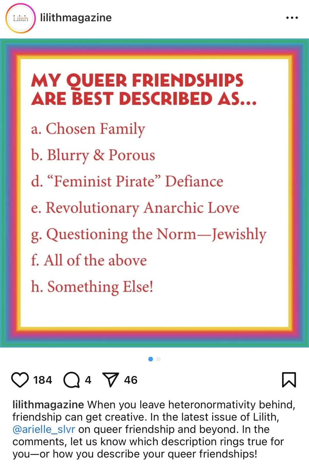 “我的酷儿友谊可以这样形容……a. 自选的家人, b. 模糊而有弹性, c. “女权海盗”式的反叛, d. 革命性的、无政府主义的爱, e. 质疑常规, f. 以上皆是, h.还有别的什么东西!”