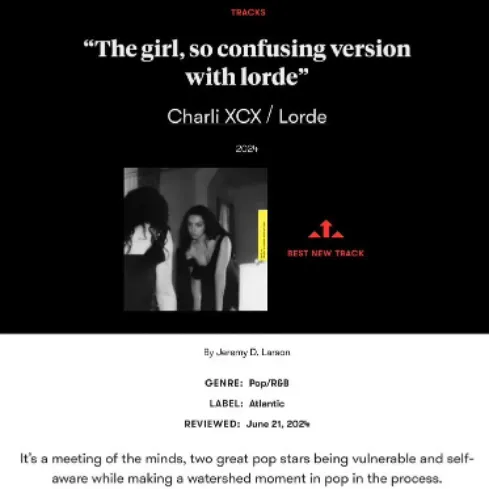 Charli xcx 联手 Lorde 混音单曲 The girl, so confusing version with lorde 荣获 Pitchfork 的 Best New Track 认证。“这是两位伟大的pop stars在思想上的交流碰撞。他们展现出脆弱和自省的一面,同时也创造了流行音乐史上的一个分水岭时刻。”