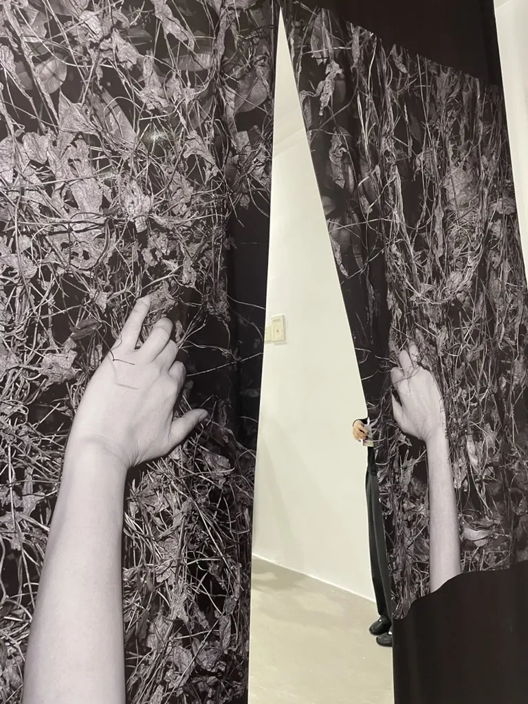 艺术家本人在现场非常详尽地给观众介绍自己的作品 —— 详尽到几乎是 one by one 一件不落地形式在介绍,包括自己的灵感、动机、拍摄地、想法等等。当我在听完一件作品介绍、试图想要悄然离去、继续我安静的一人观展之路时,艺术家却机敏地抢先一步,说道:“来,请大家和我到这边来吧,来看这件作品。”