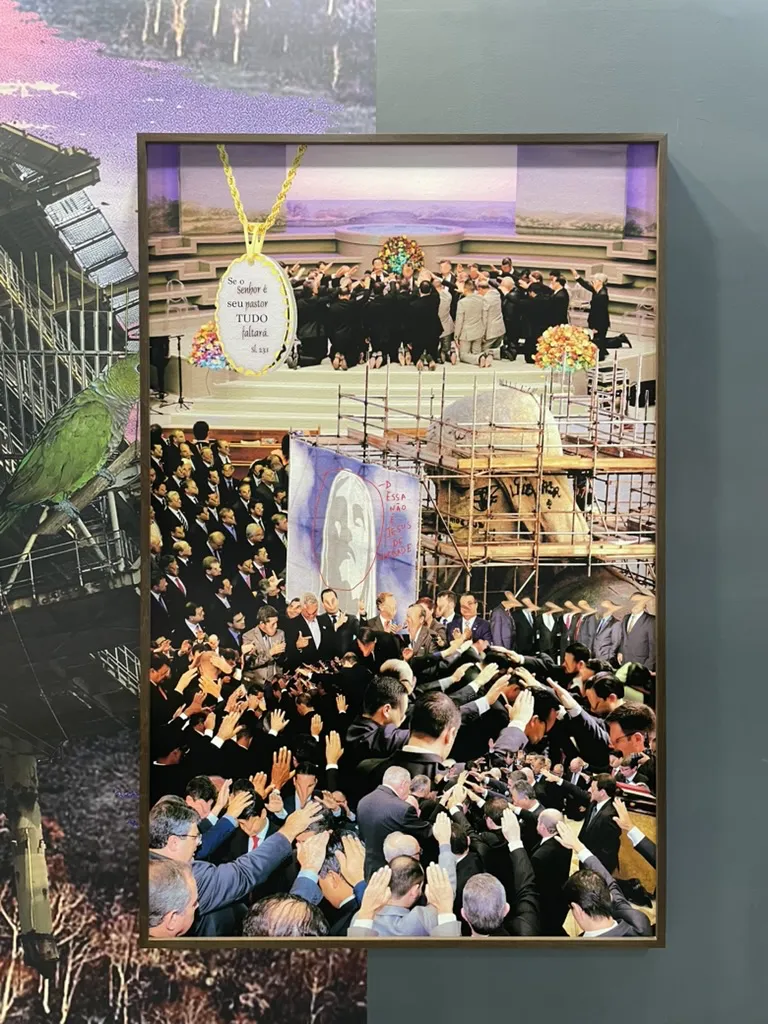 巴西艺术家文图拉·普罗法纳擅长用拼贴、影像和视觉叙事不断拆解看似熟悉却荒诞的图像框架。作品画面被切割成紧凑的碎片:宗教符号、奇怪的身体姿态、流行元素和生活细节等杂糅在一起,荒诞又好笑。