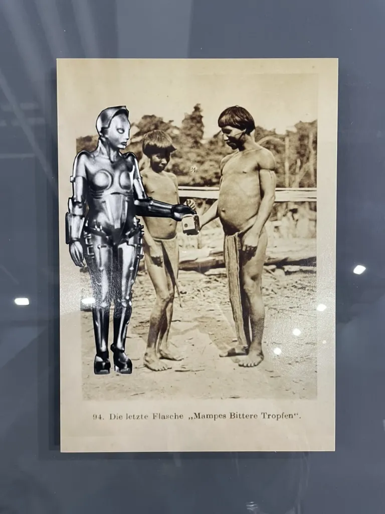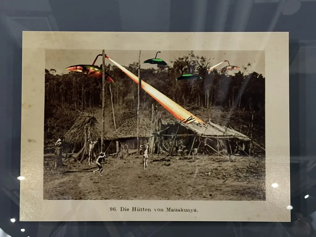 德尼尔松·巴尼瓦是来自亚马逊的原住民艺术家,他的作品经常重新取用殖民历史图像、旧档案与文化符号,通过拼贴把“历史”剪成碎片再重新组合。