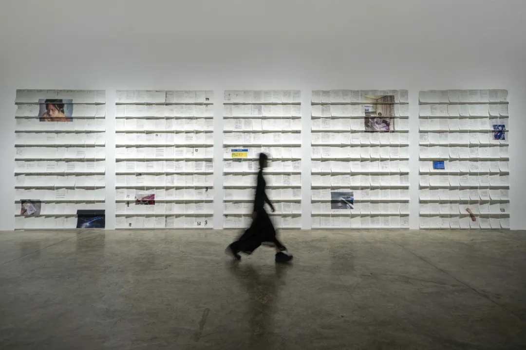 在三影堂二层中央,正在展出艺术家刘清华与杨佳馨的双人展《金属游历》。左墙几乎被印有文字的纸张覆盖,走近才发现是病历、处方笺、护理记录等就医档案。最深处的小房间里,放映着一段模糊影像。