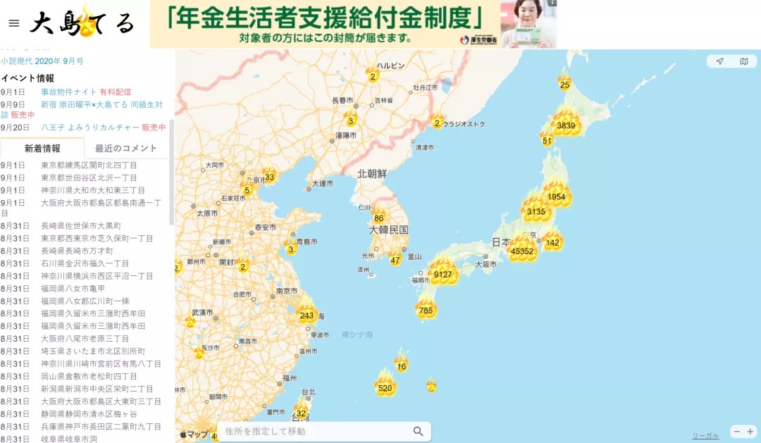 在日本,“孤独死” 已经成为了一种社会问题。独居者在屋内去世后数日才被发现,已经不再能够成为新闻。日语中经历过非自然死亡的房屋叫事故物件,一位名叫大岛照的人创建了较为知名的事故屋公告网站「大島てる (大島Teru)」,网站采用开放投稿制,用户可以自行上传已知的事故屋信息,也能随时对谬误信息发起质询、申请修改。每一处事故屋信息精确到单元与户号,包含死亡时间、事件经过以及案件处理结果。