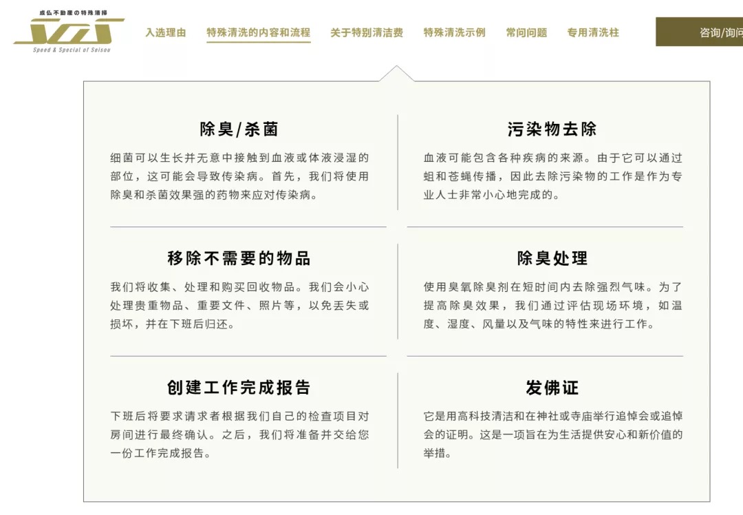 除了资讯网站,日本也相应地发展出了比较垂直的事故屋买卖租赁中介,比较有名的是「成仏不動産」,从房屋估值、特殊清洁、法事处理到买方联络提供了较成体系的解决方案。在他们的官网上,死亡事件、死亡天数、尸体情况等皆被细致分类评级,以特殊清洁为例,清洁金额会因季节、发现时间、死亡地点等而异,官网制作了矩阵图以示说明。