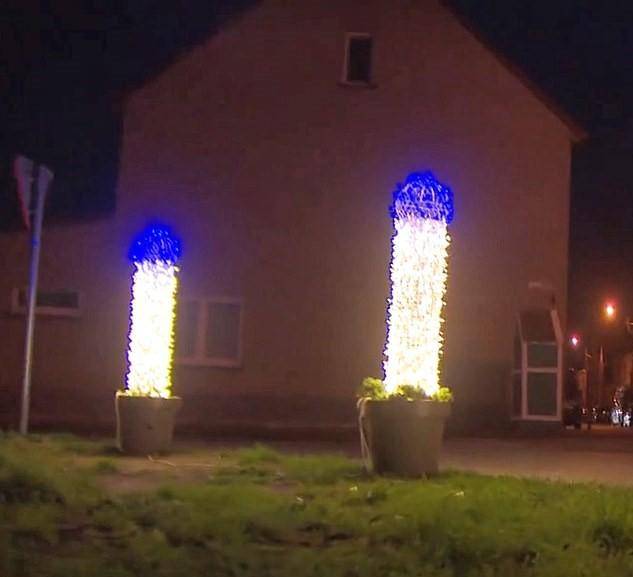 市政工作人员原本想做的是蜡烛形状的彩灯,但后来觉得蜡烛顶端的火焰太老套了,于是灵机一动放了一个蓝色的球作为代替。市长表示:“我第一次在白天看到这些灯饰的时候,并没有觉得有什么不妥。但晚上灯一亮我就立刻注意到了。不过我看不出有什么必要移除或更换它们。乐观点看,今年我们将拥有全国最受关注的圣诞灯饰。”
