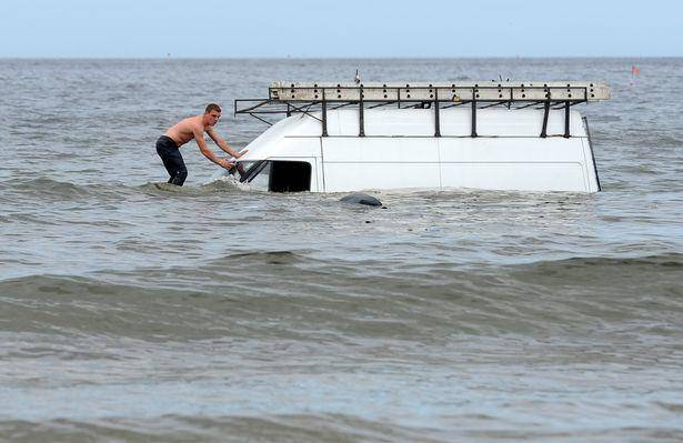 在一个阳光灿烂的夏日午后,英国北约克郡的海滩上上演了十分精彩的一幕。一辆白色的面包车浸没在海里;一辆拖车试图把它救上岸,可是拖绳却不停地断掉;在这戏剧性的一幕中,一名没穿上衣的半裸肌肉男子决定游到车顶上去合影留念,并从车中救出了四包香烟。