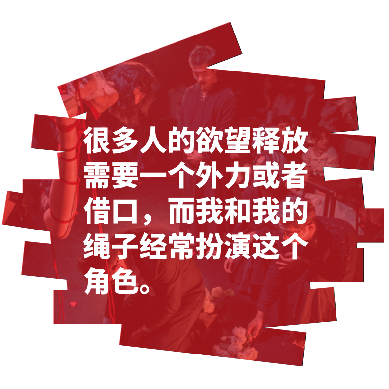 面前的人慢条斯理地说道。黑框眼镜,说话有条不紊的,典型的北方口音,窗外施工的噪音甚至压过了他的声音。CK,80 后职业绳缚师,杭州著名多元亚文化社群「黑物社」的主理人。常在江浙沪包邮地区游走,玩绳的大多都听过他的名字或参加过他举办的派对。社交媒体账号被禁对他来说是常事,于是他的派对几乎都开在地下酒吧里,仅靠微信社群和推特传播。黑物社 kinked 派对基本每月都会举办一次,其他活动相对随机,但差不多每周末都有。除了周末,周中 CK 也不闲着:每周二三四雷打不动地在他的绳室举办开放交流活动。因为周末活动人较多,不适合参与学习和体验,所以周中的交流活动是为了让更多的新人接触绳缚。目前,黑物社社群成员主要以 90 后和 95 后为主,CK 说这些人属于受过良好教育,有相对稳定工作,又比较爱玩的年轻人。基于隐私保护,社团成员之间并不会过多打探个人信息,但也不会对个人情况讳莫如深。“在社群内并没有戴着面具社交的说法,大家都是非常真实的。”虽说社团内还是元老居多并且会定期施行 “清理”,但黑物社并不会刻意区分所谓 “圈内人” 和 “圈外人”。 “我们是开放流动的社群,致力于消除隔阂和去污名化。只要你对小众文化感兴趣,愿意以平等包容的心态加入我们,都会受到热烈欢迎的。我们唯一的筛选机制或者说门槛,就是要先来线下参与 kinked 派对或者其他公开活动,做一些面对面的沟通了解。”在杭州城郊居民区里绕过九九八十一道弯之后,我终于找到了 CK 的绳室。房间的隔音做得很好,踩着厚厚的泡沫地毯,心好像放下了一点。绳室里有七个学员,正央求着 CK 教他们如何打个最结实的结。