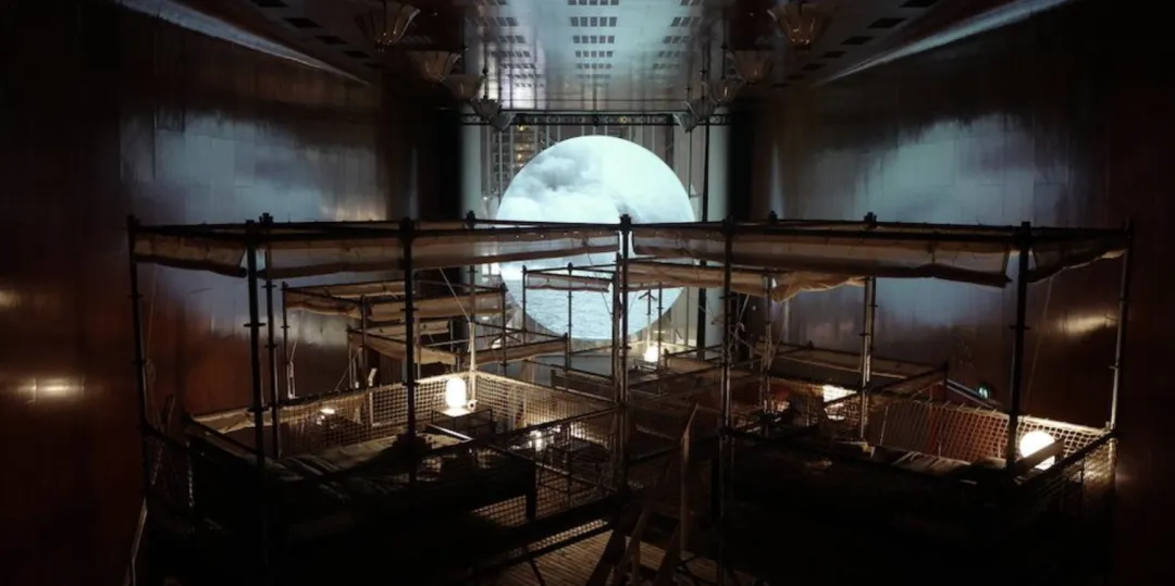 这个作品由一块巨大的圆形屏幕和八张双层床组成,播放的内容是一些影像档案片段。观众作为住客被邀请在夜间的黑暗空间进行观看,可以在放映中自由睡去、醒来、再进入影像,用感官参与延续的影像共振。在阿彼察邦这里,睡眠创造而非阻碍了观看的意义。