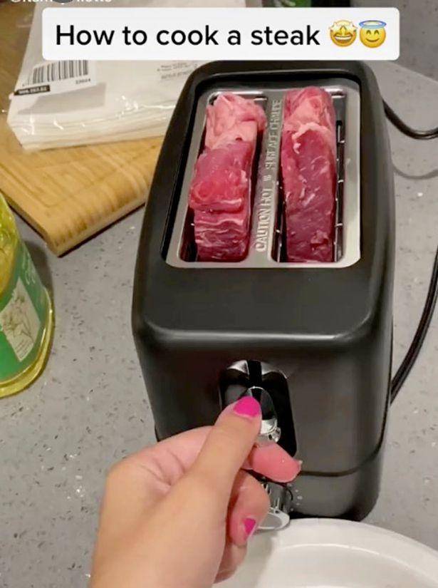 TikTok 网红 Itsmeju1iette 上传了一段视频,在视频中她展示了自己特别的烹饪牛排技巧:将牛排放入烤面包机中并按下开关,待牛排烤熟之后取出淋上酱汁,两块美味的牛排就完成了。