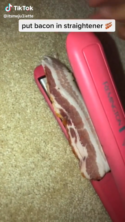 此外,天才般的 Itsmeju1iette 还发明了用咖啡机煮肉丸意大利面、熨斗烤汉堡肉,滚筒烘干机烤热狗、直板夹烤培根等突破性的烹饪方法。