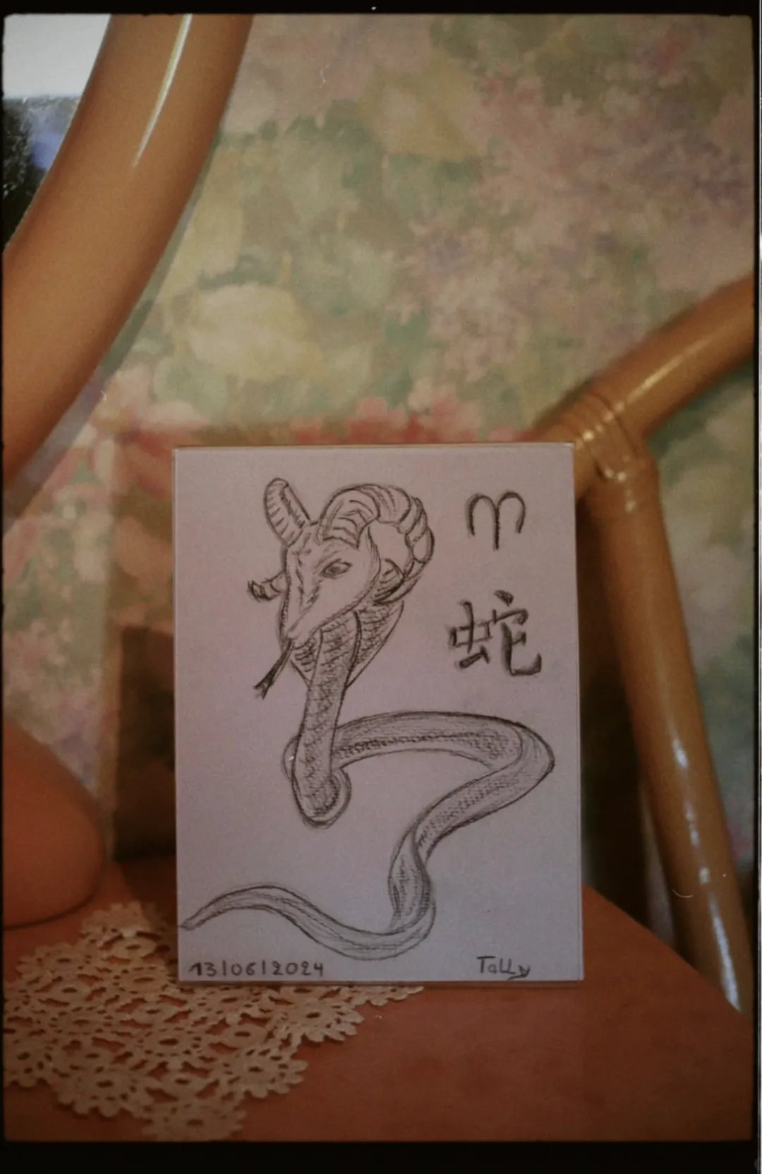 最后一天,大姨送给我一张画,说是我的属相“蛇”和星座“羊”的结合体。她说她给每个换宿者都会画,有些人最后“忘记拿走了”。